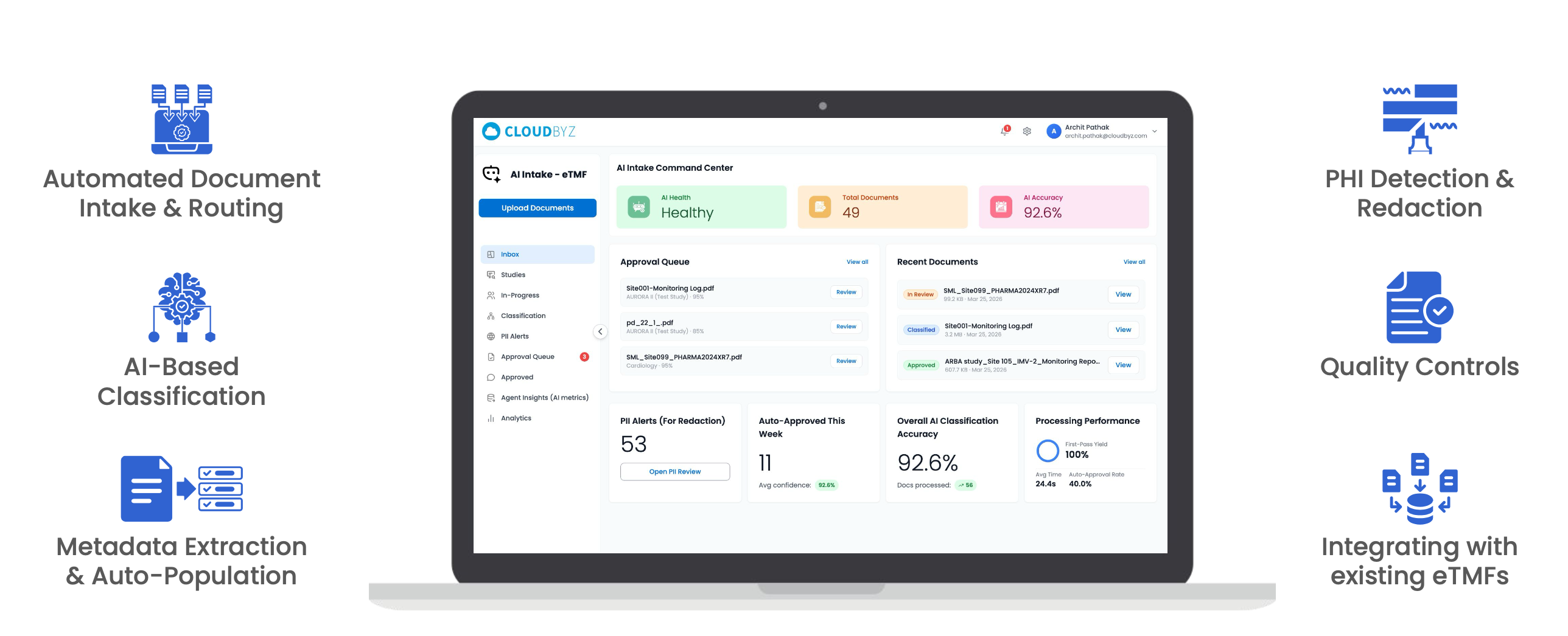 Every time a reviewer corrects the AI, that's a training signal. The model learns your organization's specific document patterns — your CROs' file naming, your sites' templates, your therapeutic area's edge cases. Over time, the confidence distribution shifts upward. The auto-approval rate climbs. The review queue shrinks. And because the accuracy metrics are visible on your dashboard, teams can see the AI becoming more reliable — which builds trust faster than any demo ever could.