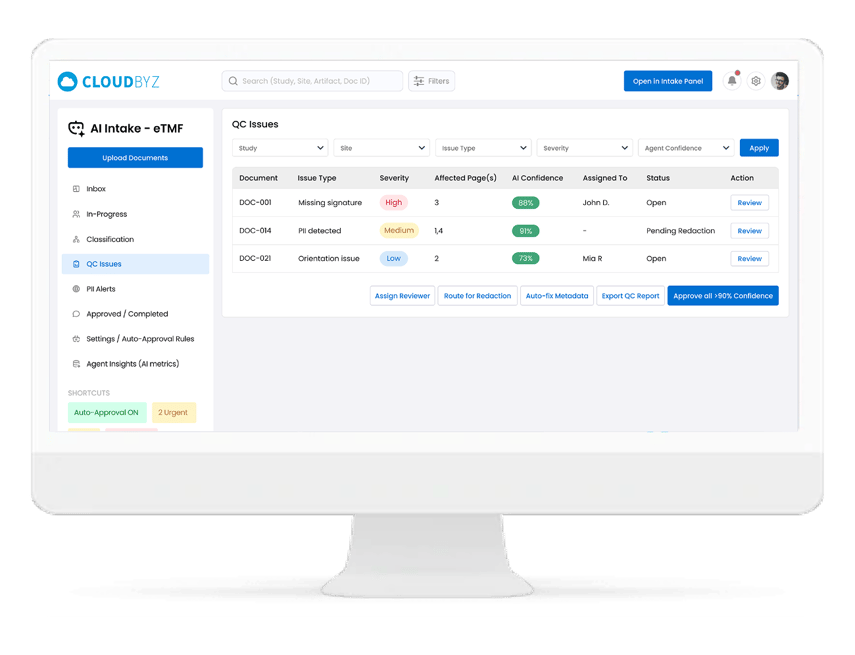 - Improves sponsor trust with real-time completeness and QC dashboards — sponsors can see the state of their TMF at any moment. That visibility is itself a competitive differentiator.